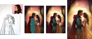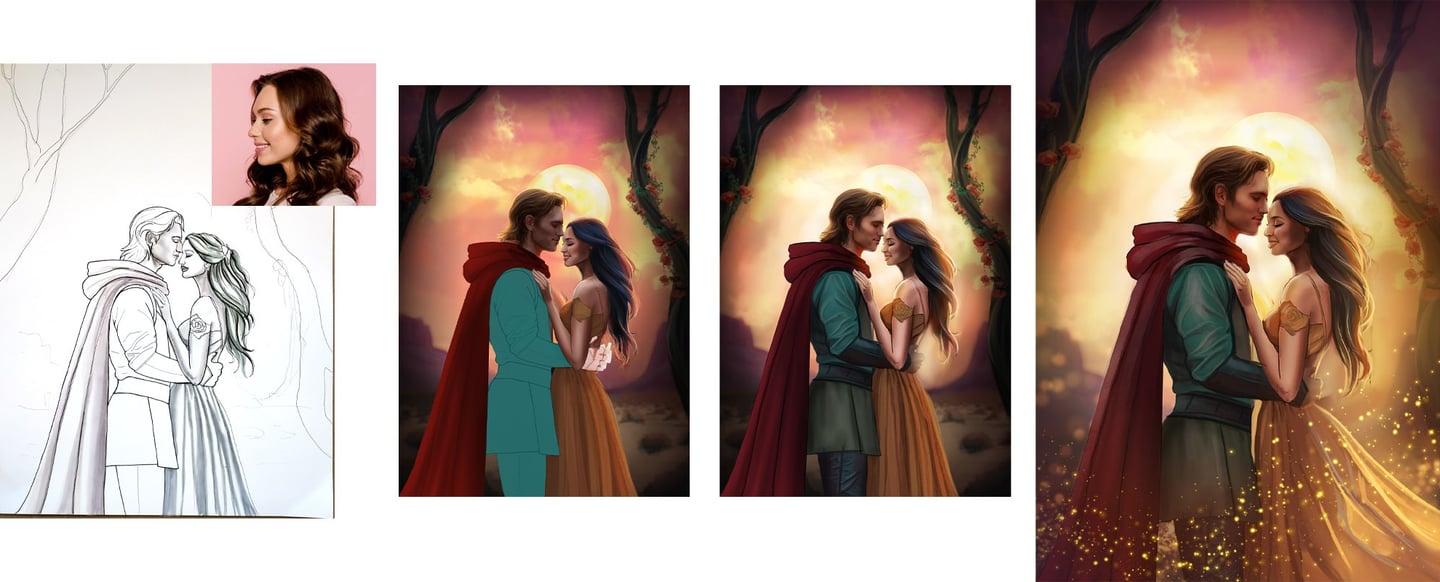 Next is the cover for “Heart of the Desert,” a fantasy romance novel to be released soon. For this project I followed my usual process of: sketch, rough draft, nearly finished, and then the final touches and special effects that really bring the piece to life. I usually do a more detailed sketch but for this piece a simple outline was enough to figure out the composition.