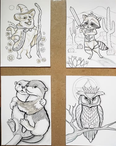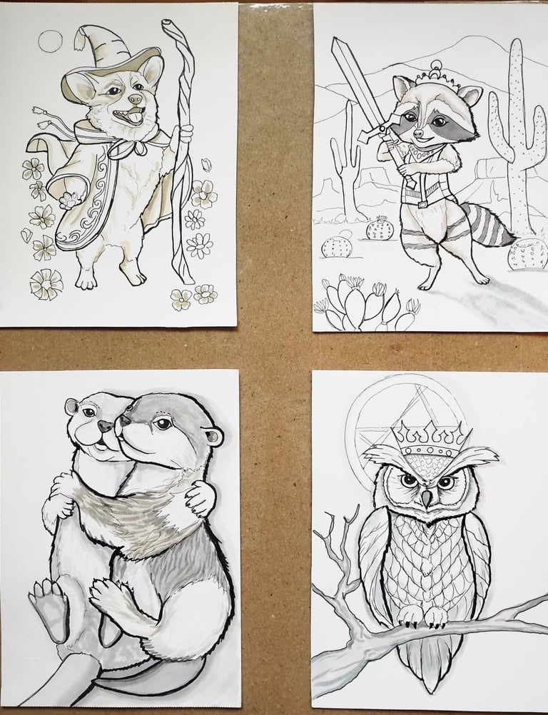 The first is tentatively called “Tarot Tails.” It’s an animal inspired tarot where each species representing a suit. Otters are cups, raccoons are swords, owls are pentacles, and corgis are wands: