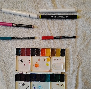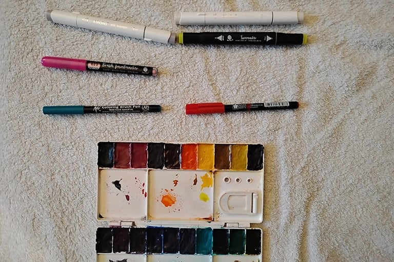Water marker: Good and with nice color settling. However, the Koi markers have an extra soft brush nib which made a terrible scraping sound against the paper. Yikes!